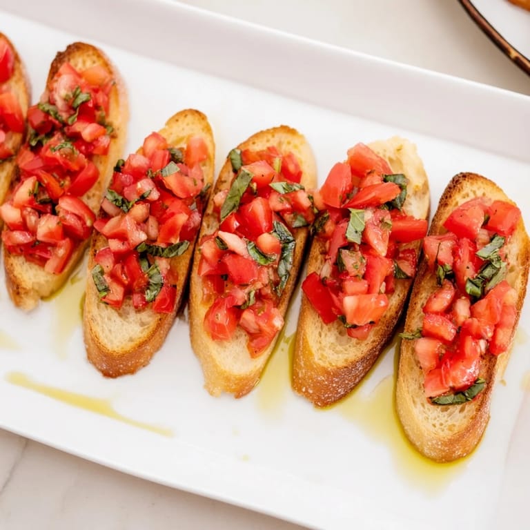 Save Crispy baguette slices topped with juicy tomatoes, fresh basil, garlic, and a drizzle of olive oil, served in an elegant diagonal line perfect for a simple, crowd-pleasing appetizer.