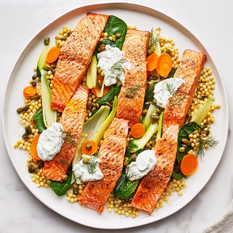 The infinity loop isn't just visually clever—it serves a real purpose. When you eat in that flowing pattern, you're naturally guided through a progression of flavors. You might start with couscous and spinach, move through vegetables, encounter salmon, and finish with the bright yogurt dressing. It's like the dish is telling a story as you eat, each component building on the last. I've noticed that when people eat from a plate arranged this way, they slow down. They become more intentional about each bite. Food arranged with thought tastes better, somehow.
