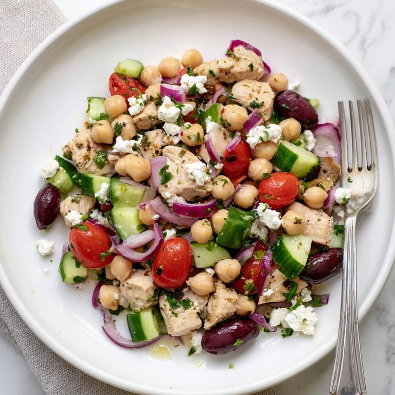 Save The afternoon sun hit my kitchen counter just right as I assembled this salad for the first time. I had leftover grilled chicken from the night before and a can of chickpeas that had been sitting in my pantry for weeks. Something about the combination of crisp cucumbers and briny olives against that creamy feta made everything feel brighter. It is now the salad I make when I need food that actually makes me feel good.