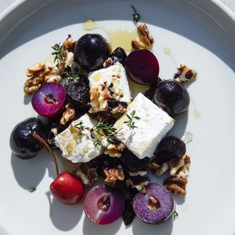 Save There's something about assembling a fruit and cheese platter late in the evening that feels like creating edible art. I discovered this particular combination on a quiet night when my fridge held beautiful purple grapes, dark cherries, and a wedge of ash-coated goat cheese that caught the lamplight like something from a gallery. The contrast between the tart, creamy cheese and the juicy sweetness of the fruit became my go-to when I wanted something that looked intentional without fussing.